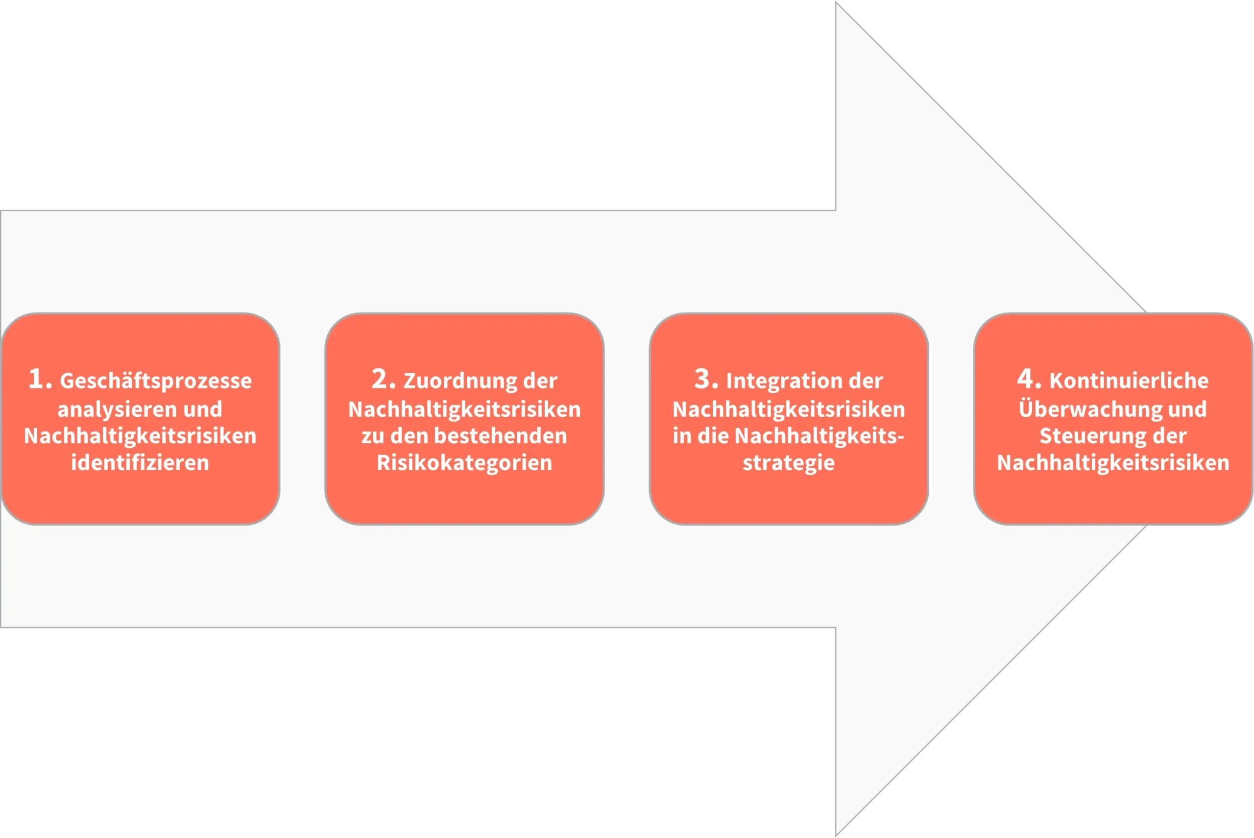 Nachdem nun die Begrifflichkeiten geklärt und ein gemeinsames Verständnis von Nachhaltigkeitsrisiken und deren Bedeutung für Unternehmen geschaffen wurde, stellt sich natürlich die Frage, wie genau Nachhaltigkeitsrisiken in das Risikomanagement integriert werden können. An dieser Stelle empfehlen wir innerhalb der BOC Group einen 4-Schritte-Ansatz, wie in der folgenden Grafik dargestellt.