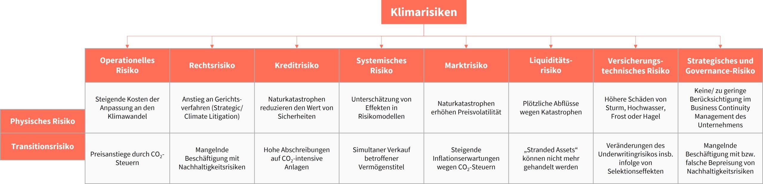 Unter Klimarisiken können allgemein alle Risiken verstanden werden, die entweder durch den Klimawandel verursacht oder durch den Klimawandel verstärkt werden. Klimarisiken lassen sich weiter in die beiden Risikokategorien physische Risiken und Transitionsrisiken unterteilen.