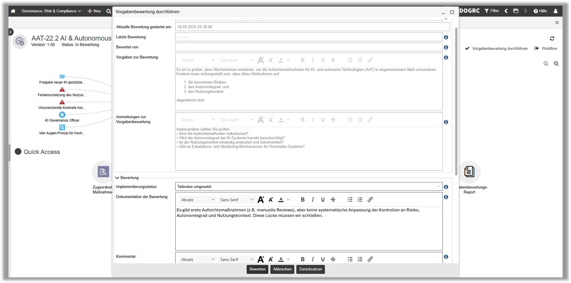 Auf Basis der gescopten Vorgabe werden nun die verarbeiteten Daten auf DSGVO und die Funktionsweise des KI-Assistentent – und AI Act-Konformität geprüft. - Maßnahmen erstellen & dokumentieren: