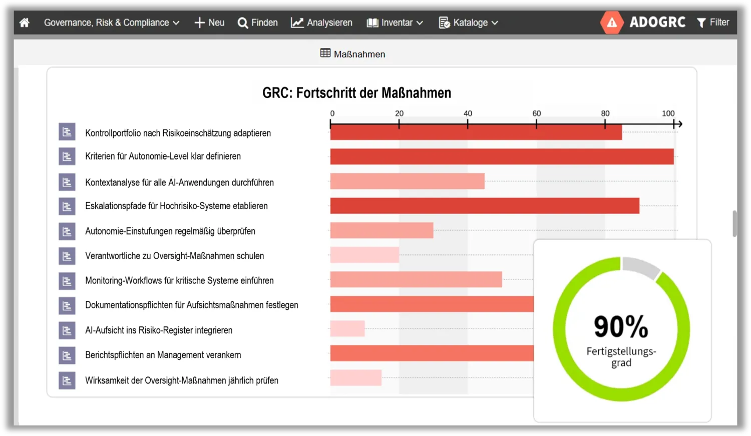 ADOGRC verankert KI-bezogene Compliance direkt in den Prozessen: Policies, Verantwortlichkeiten und Kontrollpunkte werden in Workflows eingebettet. Damit wird Governance nicht nur ein Dokument, sondern gelebte Praxis im Alltag.