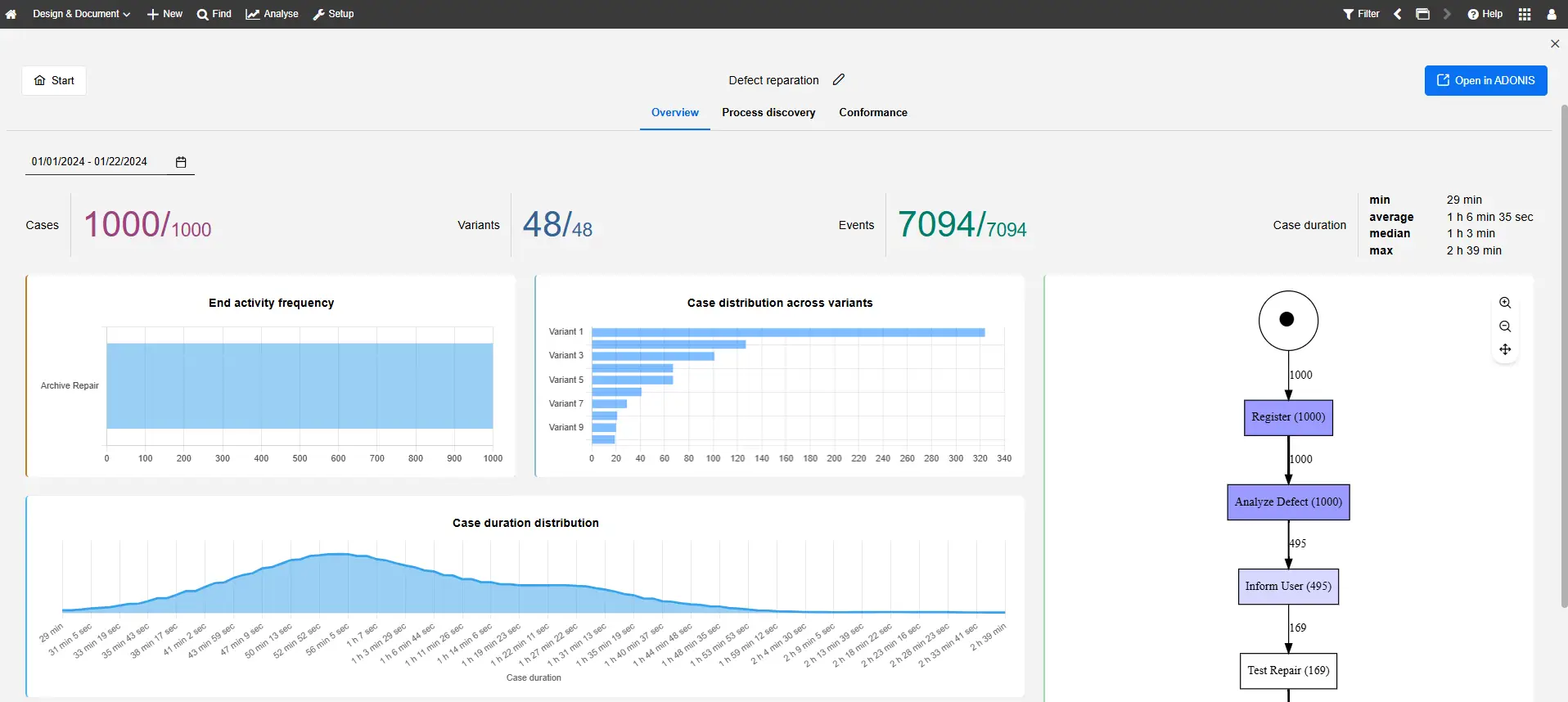 The integrated ADONIS Process Mining solution can process the historical execution data that will enable the validation and refinement of predictive indicators over time.