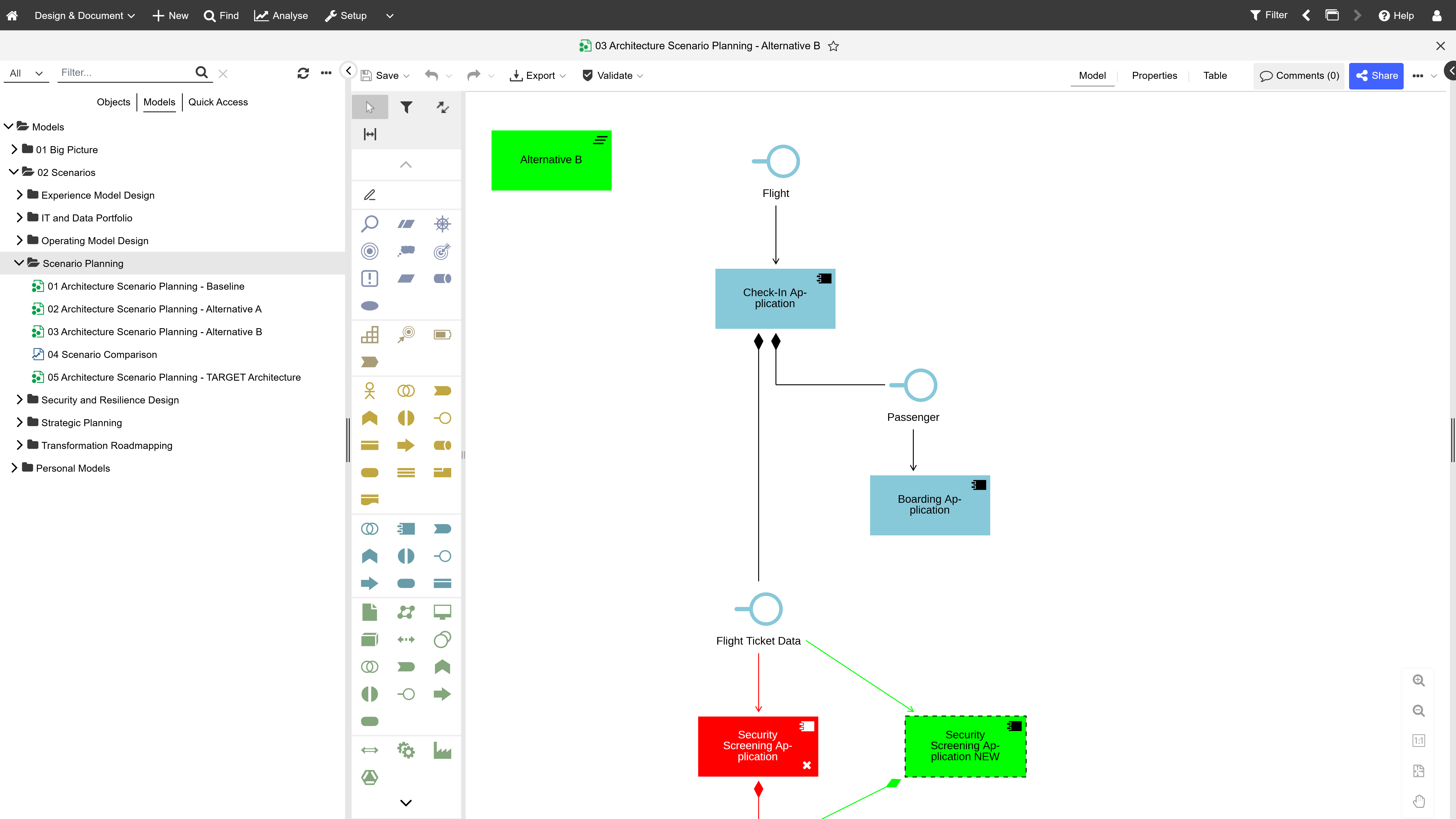 An architecture scenario in ADOIT simulating the impact of replacing a core security application within the digital twin