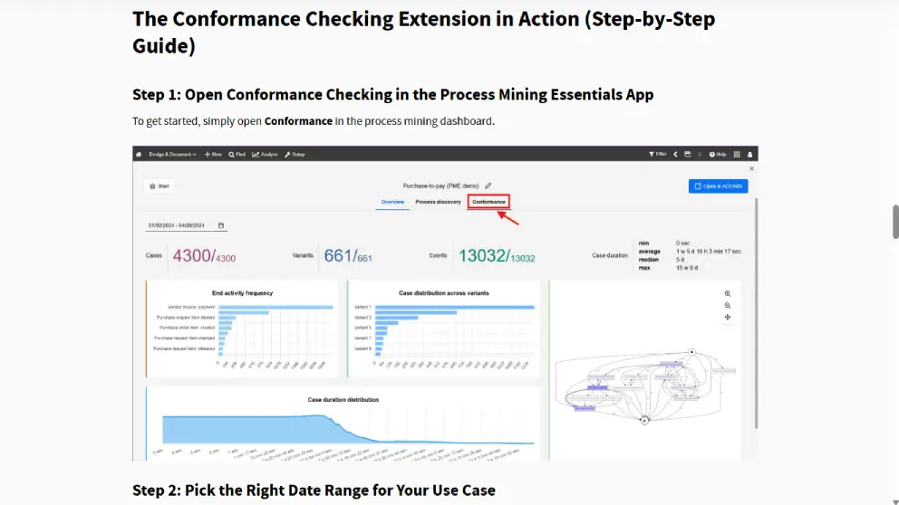 Use the linked model comparison in ADONIS Process Mining Essentials to compare documented processes with actual execution data. Detect deviations based on your designed model and validate improvements with evidence.