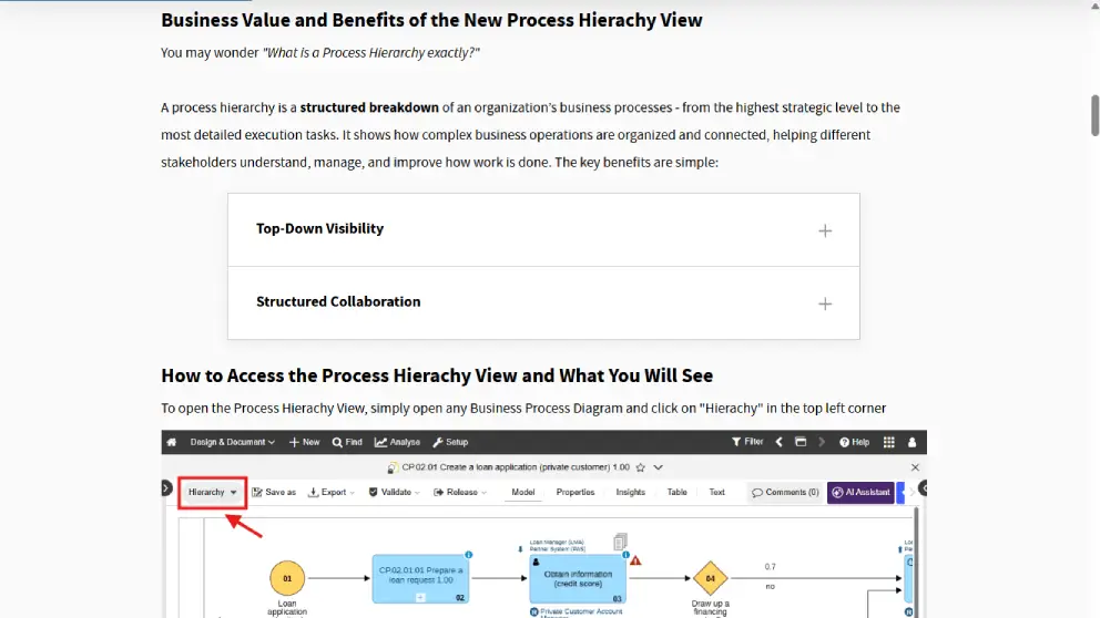 Use the Process Hierarchy View to explore how individual processes relate to higher-level structures. Access related models directly and move through the landscape efficiently.