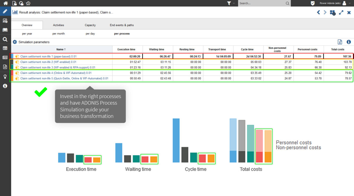 Bring your digital twin to life with ADONIS Process Simulation. Reveal bottlenecks, measure the impact of changes on time, cost, and resources, and see how your processes perform under different scenarios. Turn insights into smarter decisions and more effective investments.