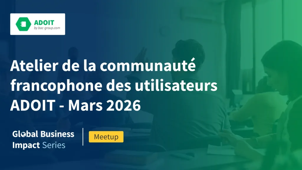 Nous préparons un événement en présentiel en Suisse, organisé en collaboration avec nos collègues suisses, afin de réunir les utilisateurs d’ADONIS et ADOIT autour d’un temps d’échange et de partage d’expériences.